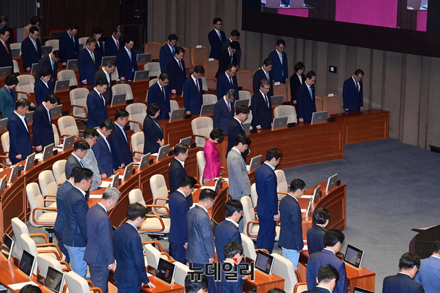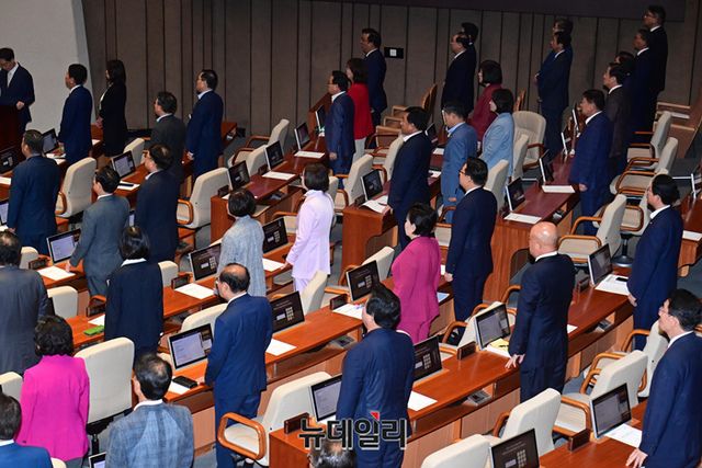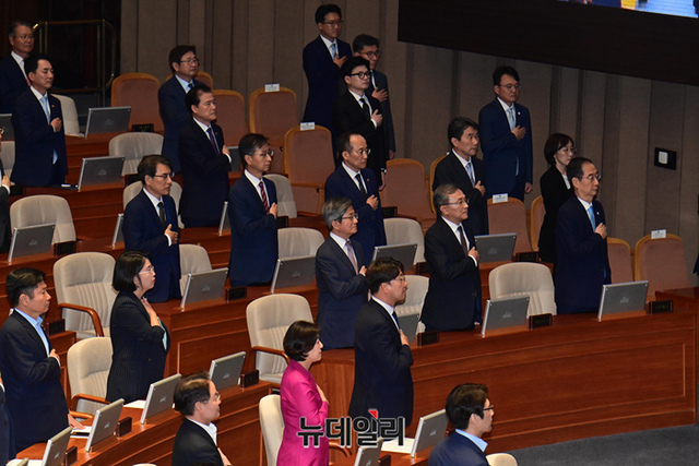[포토] 국회 개회식서 국민의례하는 의원들