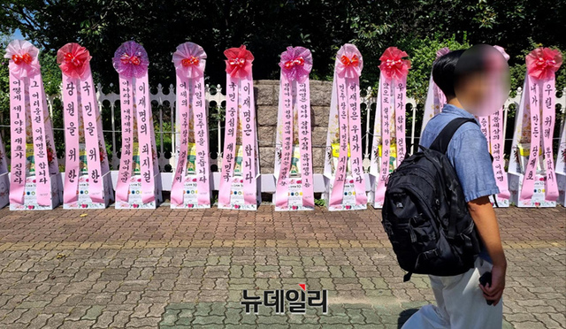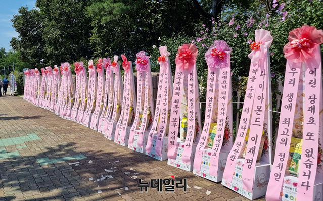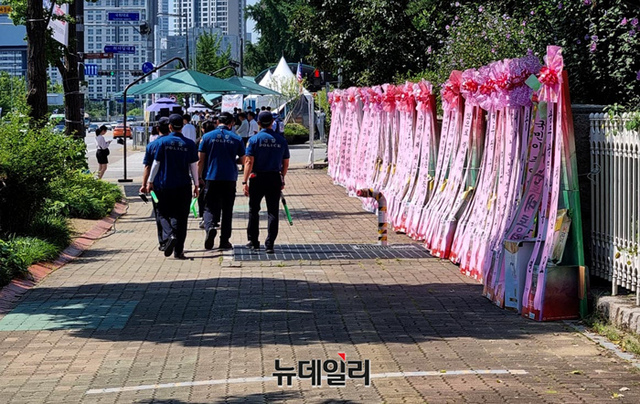 이재명 더불어민주당 대표가 무기한 단식을 시작한 이틀째인 1일 국회 앞에 취임 1주년 축하 화환이 놓여있다.