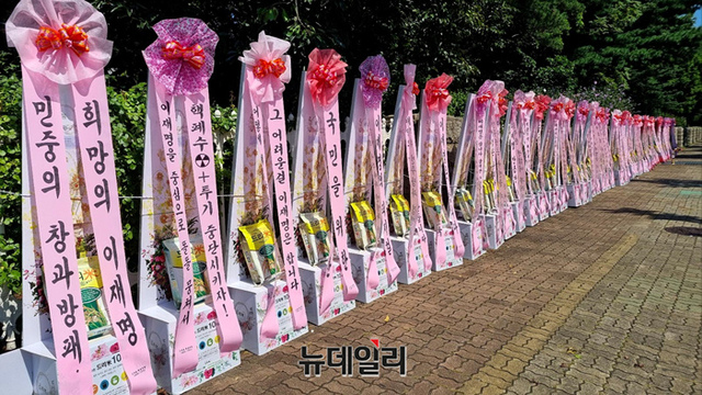 [포토] 국회 앞에 깔린 이재명 취임 1주년 축하 화환