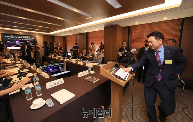 김기현 국민의힘 대표가 1일 오후 서울 중구 한국프레스센터에서 미디어연대가 주최한 '공영미디어 구조개혁과 공적 재원 확보 방안' 토론회에 축사를 마치고 취재진의 질문에 답하고 있다.이날 토론회는 김기현 국민의힘 대표, 김장겸 전 MBC 사장의 축사로 김대호 교수, 황근 교수가 각각 발제를 맡았다. 이어진 토론에는 이영풍 전 기자, 김도연 국민대 교수, 이인철 변호사, 천영식 펜앤드마이크 대표, 김인숙 서울인실련 대표, 신창섭 방통심의위 위원, 박우귀 전 방통심의워 국장이 나섰다.미디어연대는 미디어를 소비하는 수용자를 제대로 인식해야 한다며 방송의날(9월3일)이 있는 주를 '수용자 제대로 인식하기 주간(Audience Awareness Week)'으로 정하고 매년 이를 기념하는 토론회를 개최하고 있다.