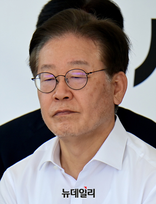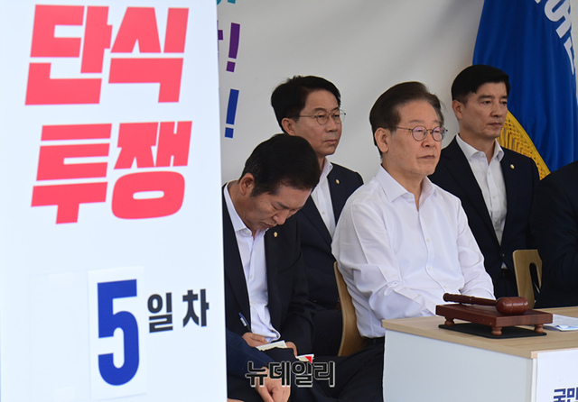 이재명 더불어민주당 대표가 4일 오전 국회 본청 앞 단식투쟁천막에서 열린 최고위원회의에 참석해 앉아 있다.