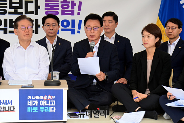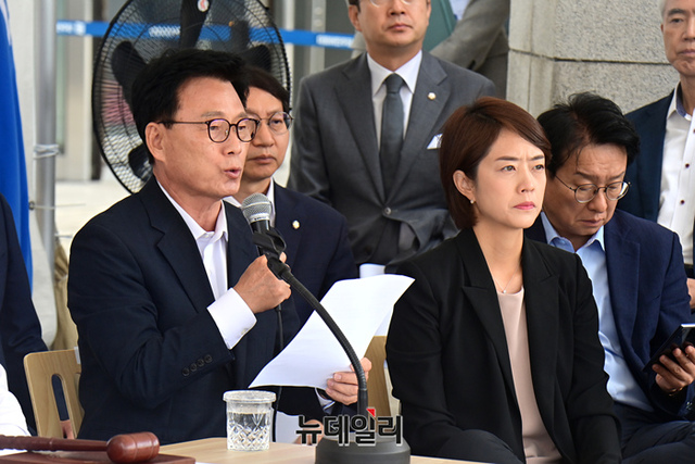 박광온 더불어민주당 원내대표가 4일 오전 국회 본청 앞 이재명 대표 단식투쟁천막에서 열린 최고위원회의에서 모두발언을 하고 있다.