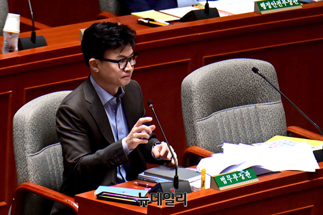 한동훈 법무부 장관이 4일 오전 국회에서 열린 예산결산특별위원회 전체회의에서 의원들의 질문에 답하고 있다.