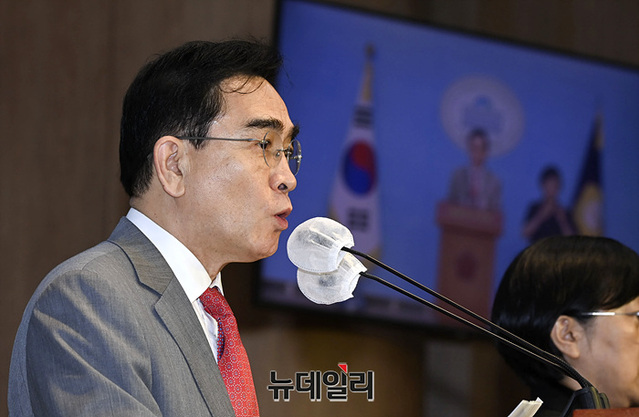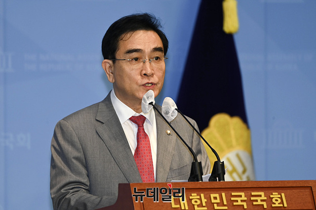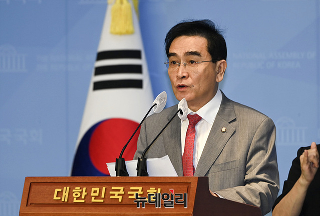 태영호 국민의힘 의원이 4일 오후 국회 소통관에서 '홍범도장군 육군사관학교 흉상 이전 문제' 언론보도 관련 반박 기자회견을 하고 있다.