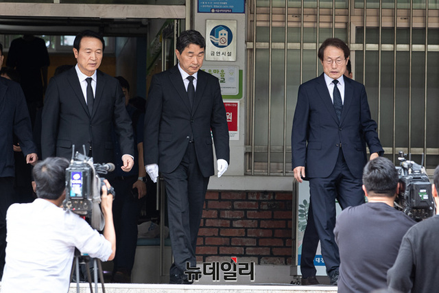 이주호 사회부총리 겸 교육부 장관(가운데)과 임태희 경기교육감(왼쪽), 조희연 서울교육감이 4일 서울 서초구 서이초등학교에서 열린 사망 교사 49재 추모식을 마친 후 취재진 질문에 답하고 있다. (사진=공동취재단)