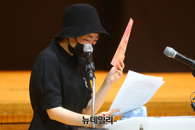 서이초 교사 49재 추모식에 참석한 고인의 동료가 4일 오후 서울 서초구 서이초등학교에서 열린 추모식에서 추도사를 하고 있다. (사진=공동취재단)