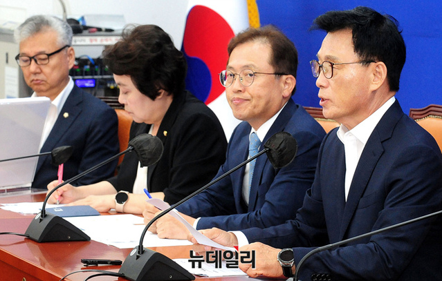 박광온 더불어민주당 원내대표가 5일 오전 국회에서 열린 원내대책회의에서 발언하고 있다.
