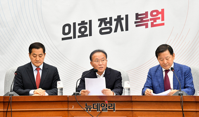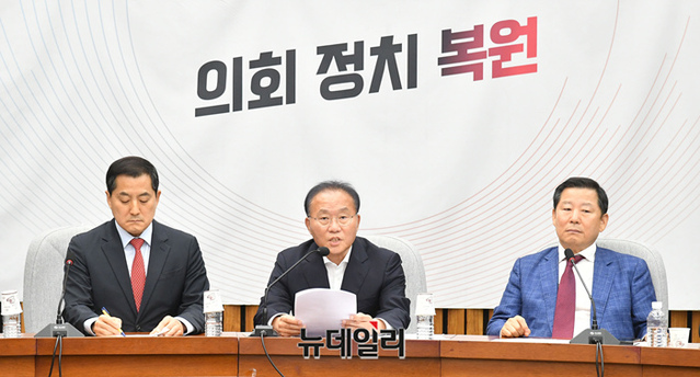 윤재옥 국민의힘 원내대표가 5일 오전 국회에서 열린 원내대책회의에서 모두발언을 하고 있다.