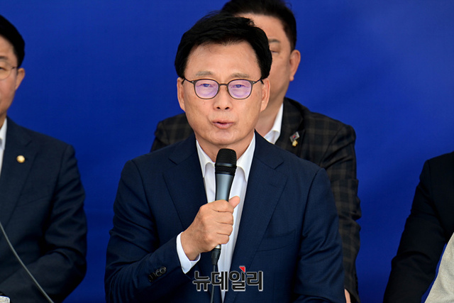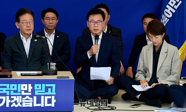 박광온 더불어민주당 원내대표가 6일 오전 국회 본청 앞 이재명 대표 단식투쟁천막에서 열린 최고위원회의에서 발언을 하고 있다.