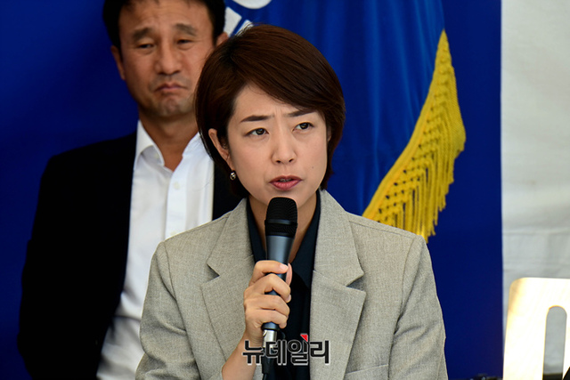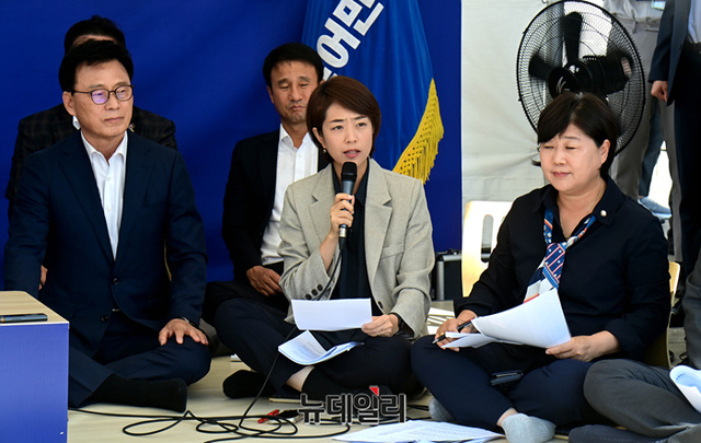 고민정 더불어민주당 최고위원이 6일 오전 국회 본청 앞 이재명 대표 단식투쟁천막에서 열린 최고위원회의에서 발언을 하고 있다.