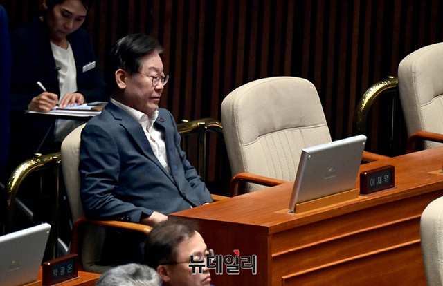 이재명 더불어민주당 대표가 6일 오후 국회 본회의장에서 열린 외교·통일·안보 분야 대정부질문에 참석해 눈을 감고 있다.