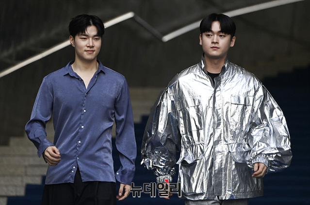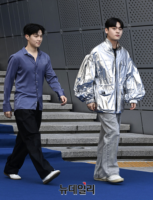 아이돌 라스 아빈과 슬레이가 6일 오후 서울 중구 동대문디자인플라자에서 열린 서울패션위크 '메종니카' 포토월에서 포즈를 취하고 있다.