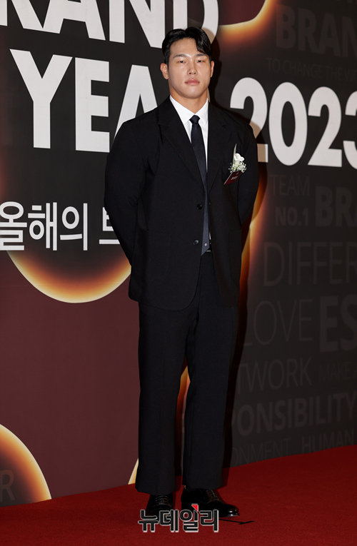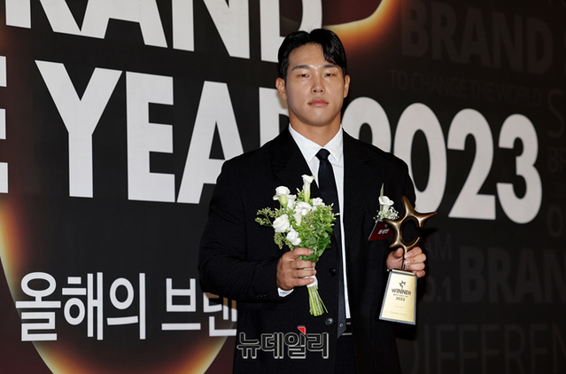 윤성빈 선수가 7일 오전 서울 중구 신라호텔에서 한국소비자포럼위원회가 주최한 '2023 올해의 브랜드 대상' 시상식에서 포즈를 취하고 있다.