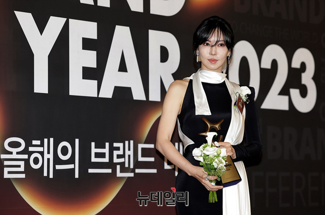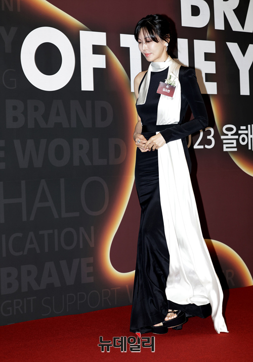 배우 김소연이 7일 오전 서울 중구 신라호텔에서 한국소비자포럼위원회가 주최한 '2023 올해의 브랜드 대상' 시상식에서 포즈를 취하고 있다.