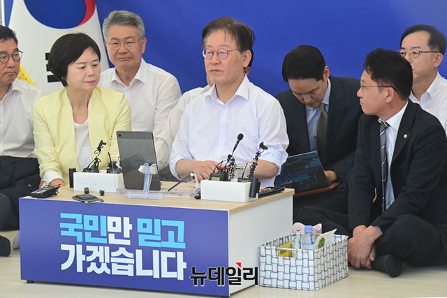 단식 8일차에 접어든 이재명 더불어민주당 대표가 7일 국회 본관 앞에 마련된 단식농성장에서 이정미 정의당 대표와 배진교 원내대표 등과 대화를 하고 있다.