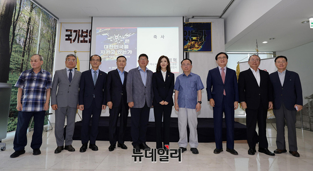 유동열 자유민주연구원장(왼쪽부터), 김학성 강원대 명예교수, 남주홍 경기대 석좌교수가 7일 오후 서울 마포구 박정희대통령기념관에서 '국가보안법은 대한민국을 지키고 있는가' 주제로 열린 동북아외교안보포럼에서 국민의례를 하고 있다.