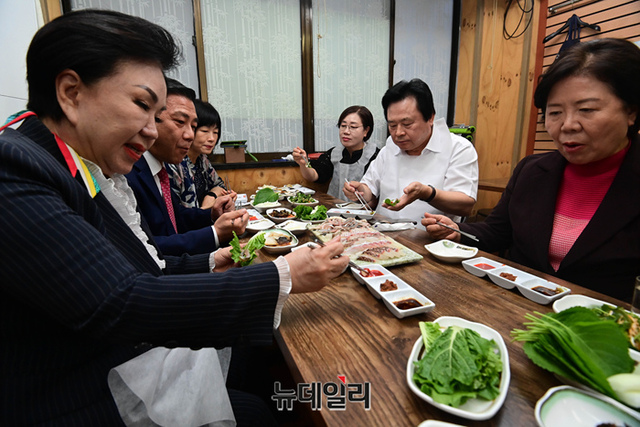 국회 보건복지위원회 국민의힘 간사인 강기윤 의원과 소속 김미애, 서정숙, 이종성, 조명희, 최연숙, 최영희,백종헌, 최재형 의원 등이 7일 오후 서울 마포구 한 수산물 식당에서 만찬을 하고 있다.
