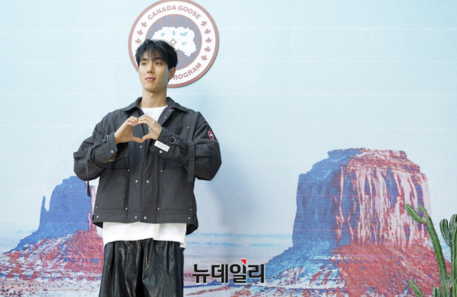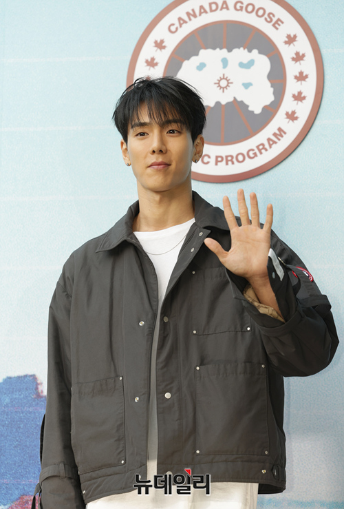 몬스타엑스 셔누와 패션디자이너 록 황이 8일 오후 서울 성동구 코사이어티에서 열린 캐나다구스 콜라보 런칭행사에서 포즈를 취하고 있다.