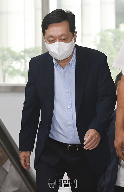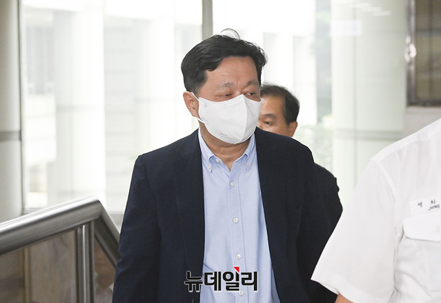 정진상 전 더불어민주당 당대표실 정무조정실장이 12일 오전 서울 서초구 중앙지방법원에서 열린 뇌물수수 혐의 관련 공판에 출석하고 있다.