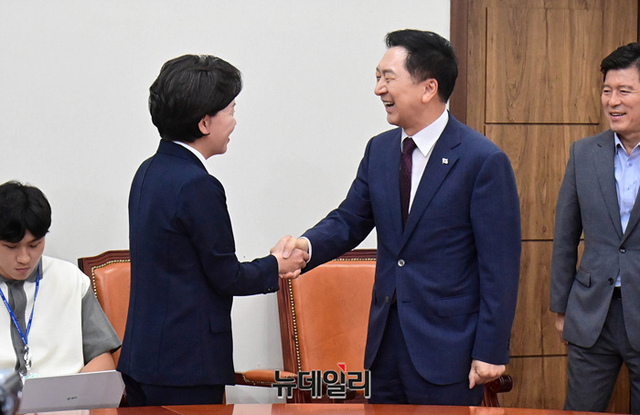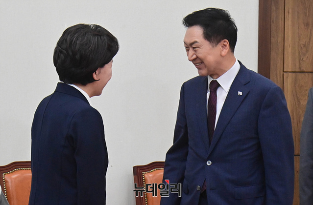 김기현 국민의힘 대표가 12일 국회에서 양향자 한국의희망 공동대표와 만나 인사를 나누고 있다.