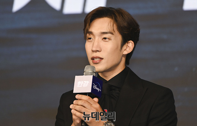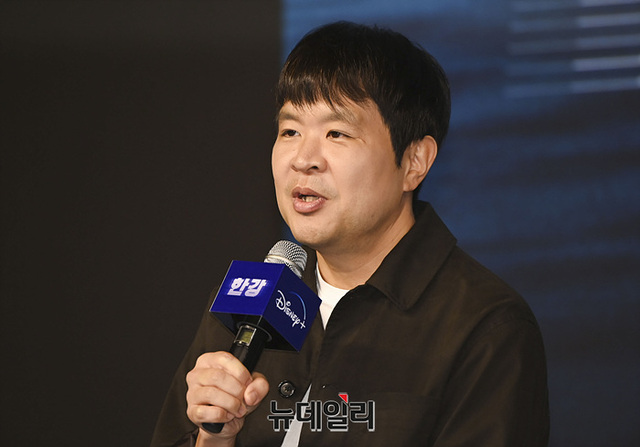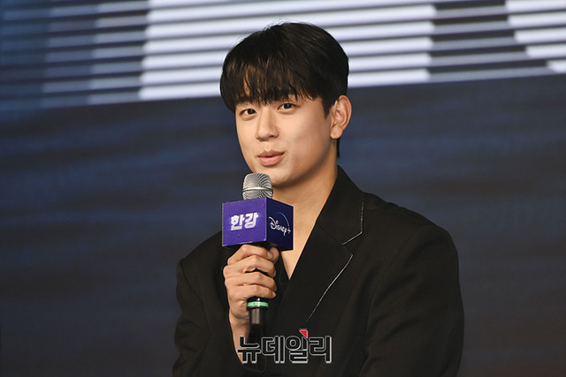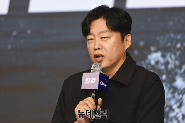 김상철 감독(왼쪽부터), 배우 신현승, 배다빈, 이상이, 김희원, 권상우가 12일 오전 서울 종로구 JW 메리어트 동대문에서 열린 디즈니+ 오리지널 시리즈 '한강' 제작발표회에서 취재진의 질문에 답하고 있다.