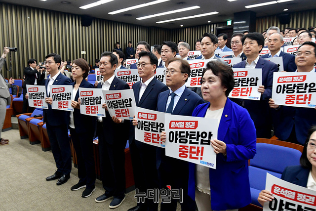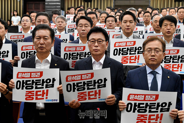 박광온 더불어민주당 원내대표 및 소속 의원들이 12일 국회에서 열린 긴급 의원총회에서 '야당탄압 중단!' 손피켓을 들고 구호를 외치고 있다.