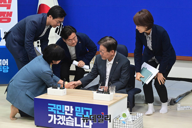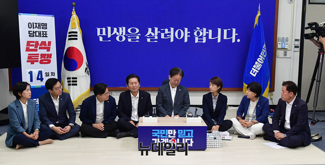 [포토] 농성장서 최고위원들 만나는 이재명 대표