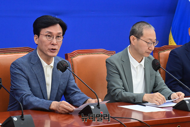 김민석 더불어민주당 정책위의장이 14일 오전 국회에서 열린 정책조정회의에서 발언하고 있다.