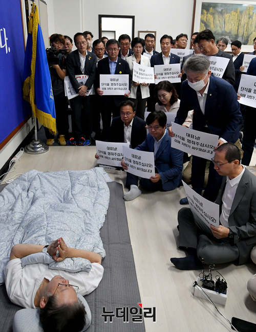 단식 투쟁 16일차인 이재명 더불어민주당 대표가 15일 국회 당대표실에서 단식중단을 촉구하는 민주당 의원들을 만나고 있다.