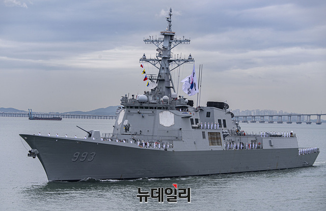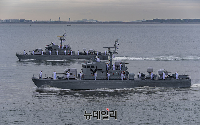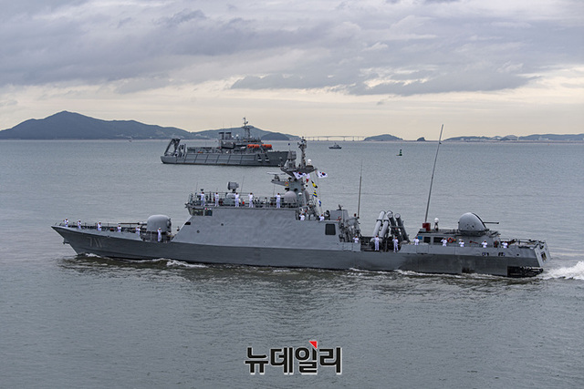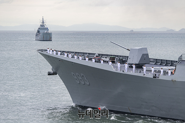 우리해군의 함정이 15일 오전 인천항 수로에서 열린 제 73주년 인천상륙작전 전승행사에서 해상사열을 하고 있다.역대 최초로 대통령이 주관한 이번 전승행사는 한미동맹 70주년을 기념하고 인천상륙작전의 역사적 의미와 가치를 재조명해 참전용사들의 고귀한 희생정신을 기리는데 중점을 둔 것이 특징이다.이번 행사에는 해군 마라도함, 서애류성룡 이지스구축함(DDG), 천지급 군수지원함(AOE), 인천급 호위함(FFG), 해경 경비함 3005호, 윤영하급 유도탄고속함(PKG), 해군 고속정 편대(PKM), 미국 아메리카급 강습상륙함, 캐나다 벤쿠버함 호위함이 전승행사에 참여했다. (인천=서성진 기자)