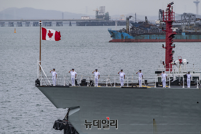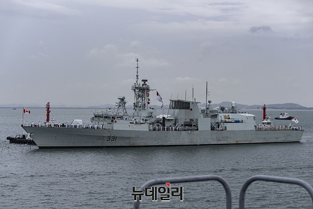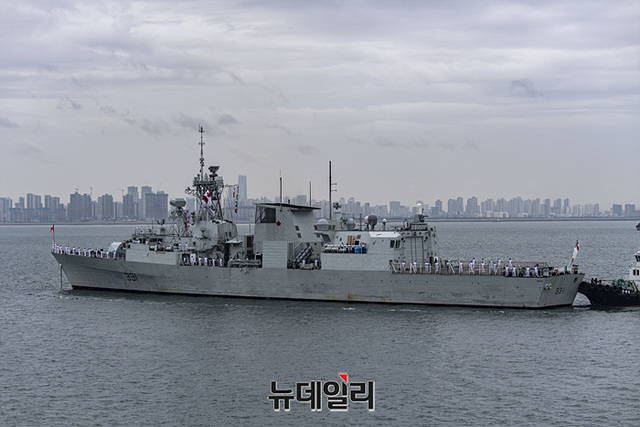 캐나다 벤쿠버함 호위함이 15일 오전 인천항 수로에서 열린 제 73주년 인천상륙작전 전승행사에서 해상사열을 하고 있다.역대 최초로 대통령이 주관한 이번 전승행사는 한미동맹 70주년을 기념하고 인천상륙작전의 역사적 의미와 가치를 재조명해 참전용사들의 고귀한 희생정신을 기리는데 중점을 둔 것이 특징이다.이번 행사에는 마라도함, 서애류성룡 이지스 구축함(DDG), 천지급 군수지원함(AOE), 인천급 호위함(FFG), 해경 경비함 3005호, 윤영하급 유도탄고속함(PKG), 해군 고속정 편대(PKM), 미국 아메리카급 강습상륙함, 캐나다 벤쿠버함 호위함이 전승행사에 참여했다. (인천=서성진 기자)