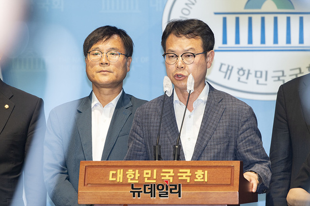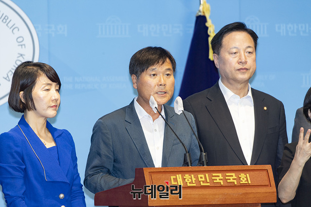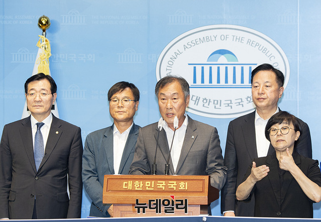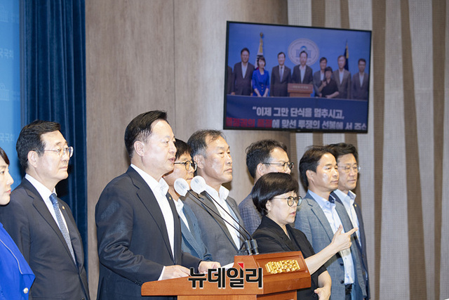 더불어민주당 경남도당 16개 지역위원회 위원장들이 18일 오후 국회 소통관에서 '이재명 당대표 단식중단 호소 및 동조단식 선언' 기자회견을 하고 있다.