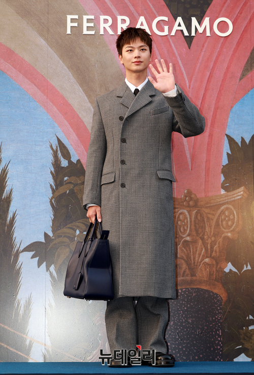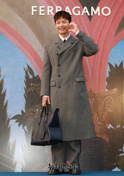 배우 육성재가 23일 오후 서울 강남구 페라가모 청담 플래그십 스토어에서 열린 2024 봄·여름 컬렉션 쇼 라이브 스트리밍 이벤트에서 포즈를 취하고 있다.