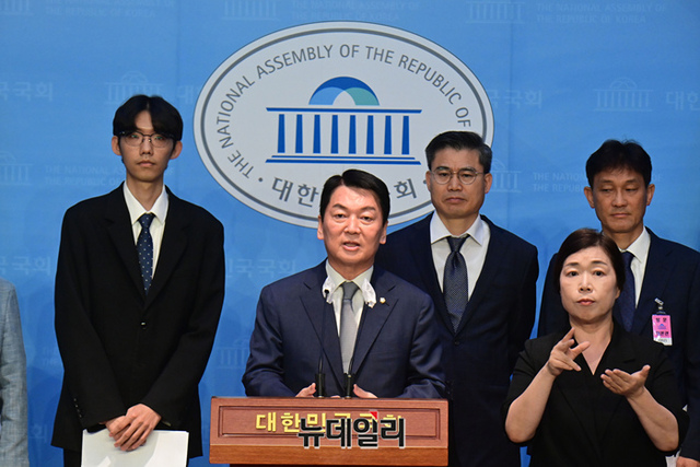 안철수 국민의힘 의원과 출연연과학기술인협의회총연합회 회원들이 25일 국회 소통관에서 정부의 연구개발 예산 삭감 관련 기자회견을 하고 있다.