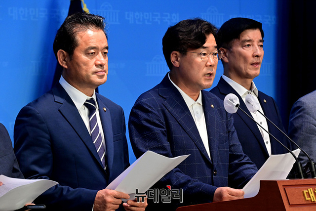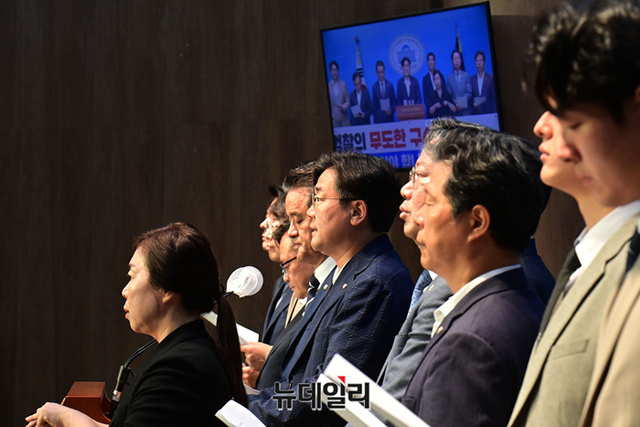 박찬대 더불어민주당 검찰독재정치탄압대책위원회 공동위원장 및 참석자들이 25일 오후 국회 소통관에서 기자회견을 갖고 이재명 대표의 구속영장 심사에 대한 입장을 발표하고 있다.