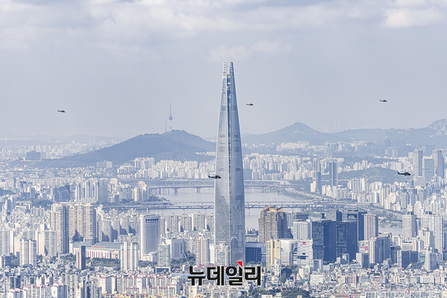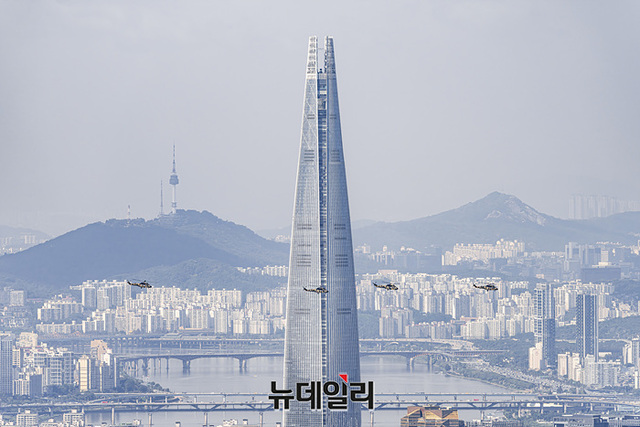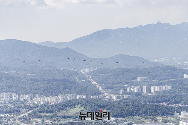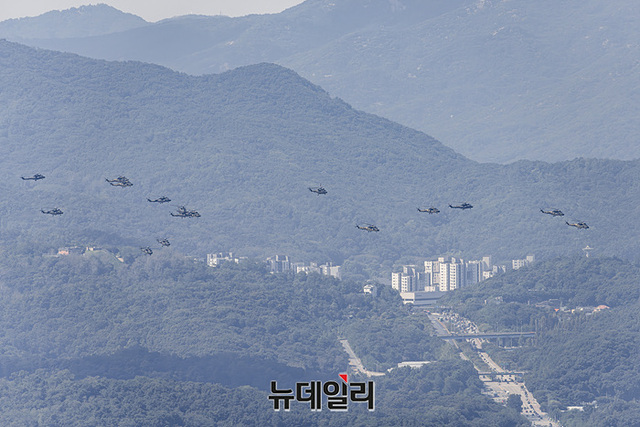한국형 기동헬기 수리온(KUH-1)이 22일 오전 성남시 서울공항에서 진행된 제 75주년 국군의 날 미디어데이에서 축하비행을 하고 있다.제75주년 국군의날은 '강한 국군, 튼튼한 안보, 힘에 의한 평화'를 주제로 26일 열린다. 이날 오전 서울공항에서 진행되는 기념식 공중분열에는 국산 기술로 만든 최초의 한국형 전투기 KF-21과 국내 개발 헬기 LAH가 선도비행한다.이어 오후에 광화문 일대에는 시가행진이 예정돼 있다. 행진에는 해군 전력 최초로 정조대왕함이 AR영상으로 서울시내에 출항한다.