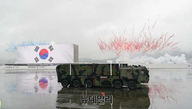 한국형 장거리지대공유도무기(L-SAM)과 패트리어트 미사일 등 3축체계로 구성된 장비부대가 26일 오전 성남시 서울공항에서 열린 제 75주년 국군의 날 기념식에서 분열하고 있다.이날 '강한 국군, 튼튼한 안보, 힘에 의한 평화'를 주제로 열린 제75주년 국군의날 기념식에서 군단 UAV-II, MUAV, 소형 드론 등 각군이 운용하고 개발 중인 무인체계와 소총조준사격드론, 다목적 무인차량, 차륜형 장갑차로 구성된 아미타이거 전투단, 한국형 3축 체계의 핵심인 장거리지대공유도무기(L-SAM)이 분열했다.