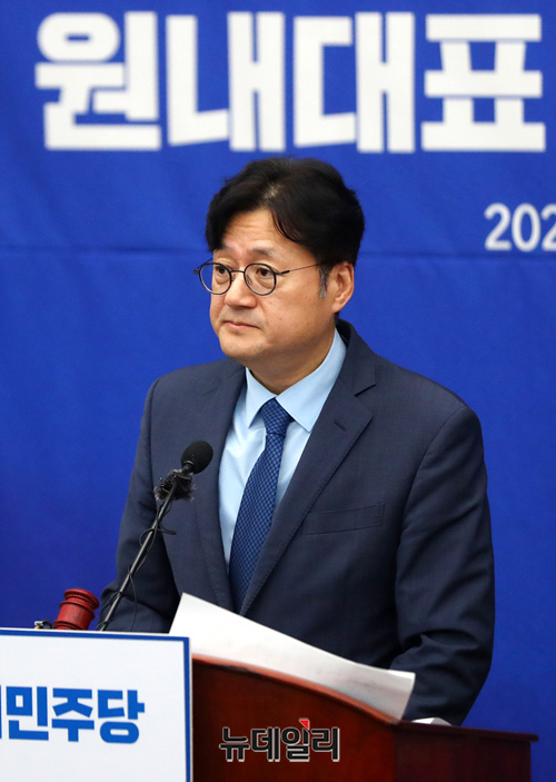 홍익표 더불어민주당 신임 원내대표가 26일 오후 국회에서 열린 '21대 국회 더불어민주당 제4기 원내대표 보궐선거 의원총회'에서 당선인사를 하고 있다.