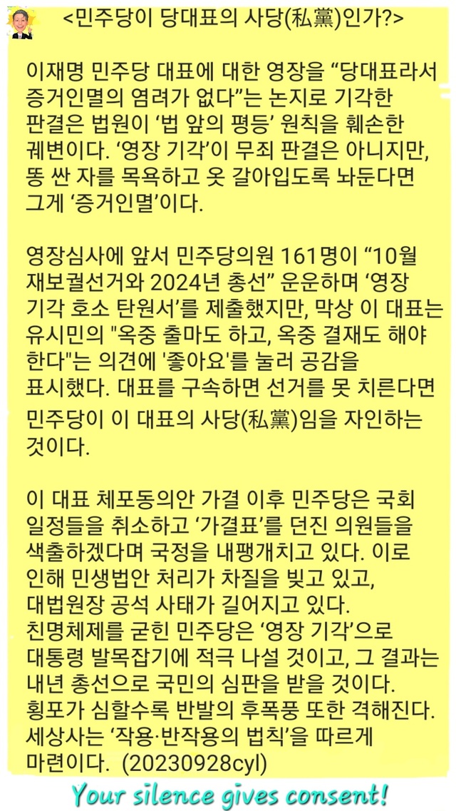 <민주당이 당대표의 사당(私黨)인가?>이재명 민주당 대표에 대한 영장을 “당대표라서 증거인멸의 염려가 없다”는 논지로 기각한 판결은 법원이 ‘법 앞의 평등’ 원칙을 훼손한 궤변이다.