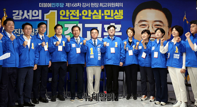 홍익표 더불어민주당 원내대표와 진교훈 강서구청장 후보를 최고위원들이 4일 서울 강서구 더불어민주당 진교훈 강서구청장 후보 선거사무실에서 열린 '민주당 현장 최고위원회의'에 참석해 파이팅 구호를 외치고 있다.