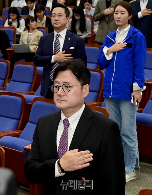[포토] 의총서 국민의례하는 홍익표 민주당 원내대표
