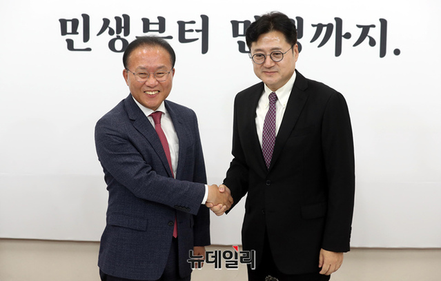 윤재옥 국민의힘 원내대표가 4일 국회에서 홍익표 더불어민주당 신임 원내대표를 만나 인사를 나누고 있다.