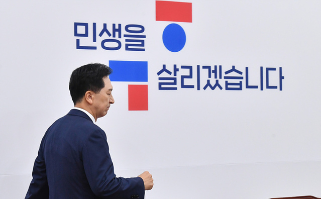 김기현 국민의힘 대표가 5일 오전 국회에서 열린 최고위원회의에 참석하고 있다.