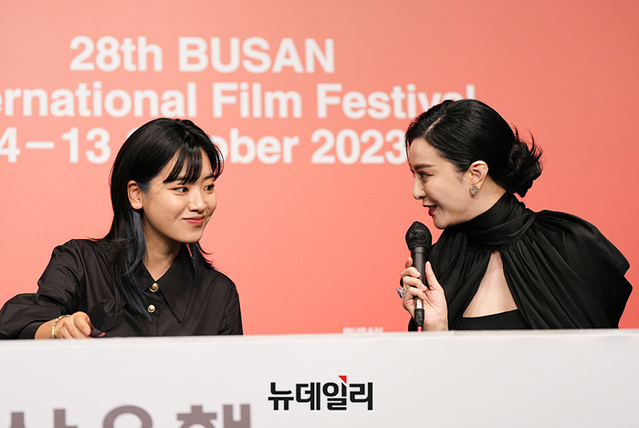 중국 톱배우 판빙빙과 한국배우 이주영이 5일 오후 부산 해운대구 KNN 타워에서 열린 갈라 프레젠테이션 초청작 '녹야' 기자간담회에서 대화를 나누고 있다.갈라 프레젠테이션은 세계적인 거장들의 신작 또는 화제작을 상영하는 프로그램이다.이번 부산국제영화제에서 갈라 프레젠테이션 섹션에 공식 초청된 '녹야'는 낯선 곳에서 쳇바퀴 같은 삶을 사는 ‘진샤’(판빙빙)가 자유로운 영혼의 ‘초록머리 여자’(이주영)를 만나 돌이킬 수 없는 밤으로 뛰어드는 이야기를 담는다.