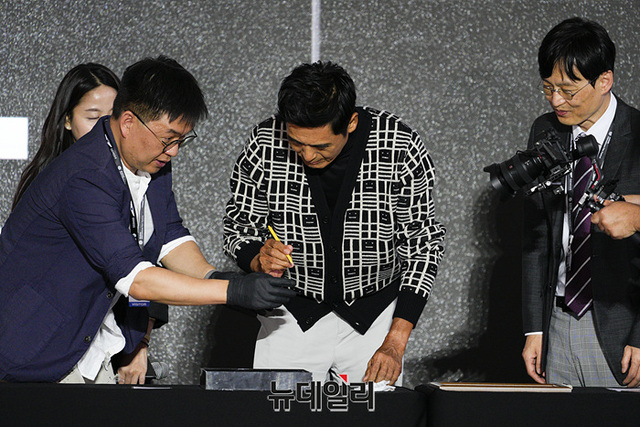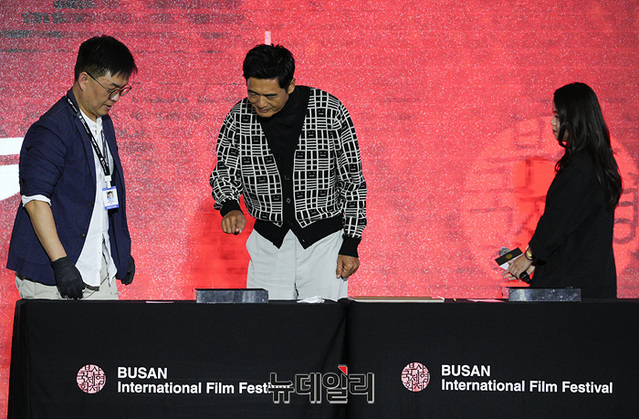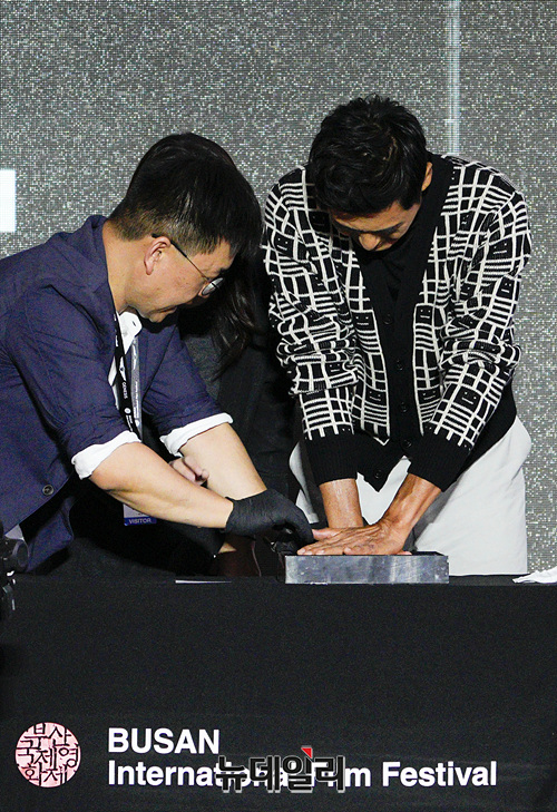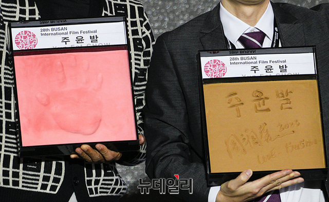 홍콩배우 주윤발이 5일 오후 부산 해운대구 영화의전당 BIFFGENESIS 야외무대에서 열린 핸드프린팅 행사에서 포즈를 취하고 있다.