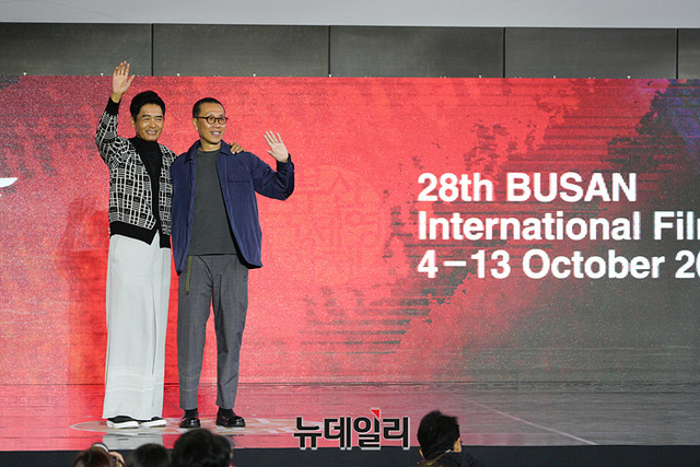 홍콩배우 주윤발이 5일 오후 부산 해운대구 영화의전당 BIFFGENESIS 야외무대에서 열린 '주윤발의 영웅본색 오픈토크'에서 포즈를 취하고 있다.