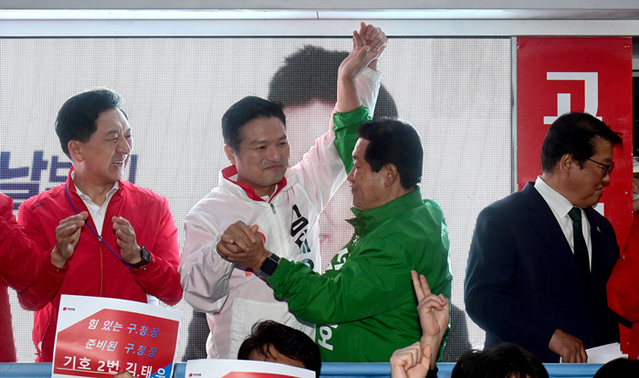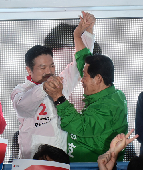 10·11 서울 강서구청장 보궐선거에 나선 김태우 국민의힘 후보와 이명호 우리공화당 후보가 5일 오후 서울 강서구 화곡역사거리에서 열린 김 후보의 집중유세에서 단일화 발표 후 손을 들어 인사하고 있다.