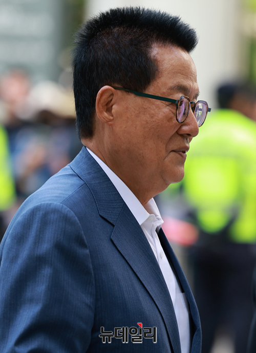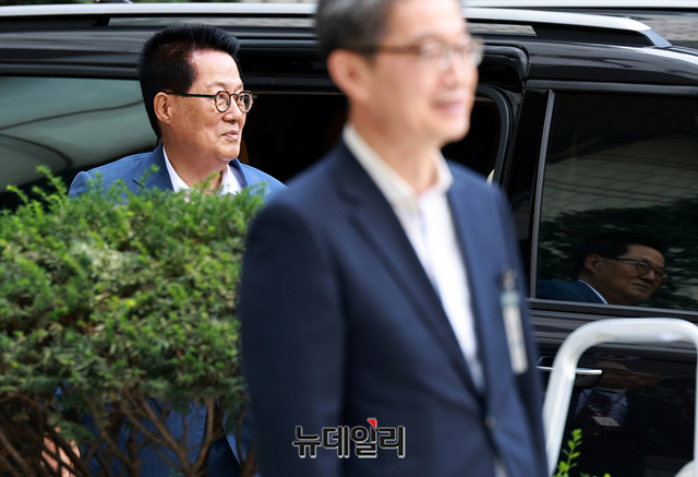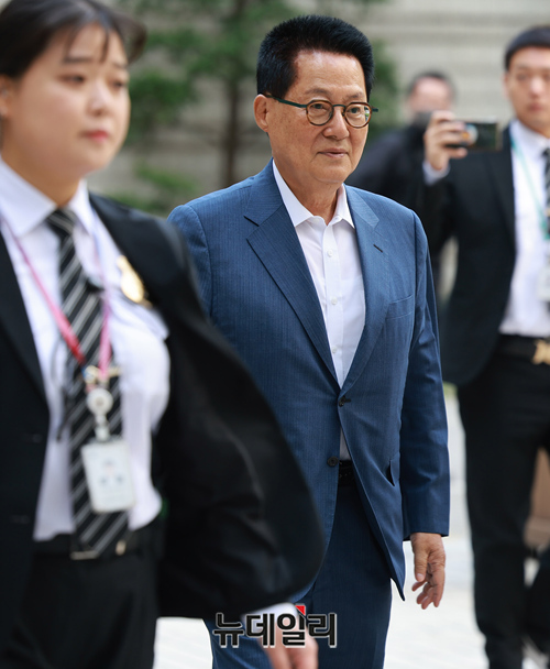 박지원 전 국정원장이 6일 오전 서울 서초구 서울중앙지법에서 열린 서해 공무원 피격 사건 관련 속행 공판에 출석하고 있다.