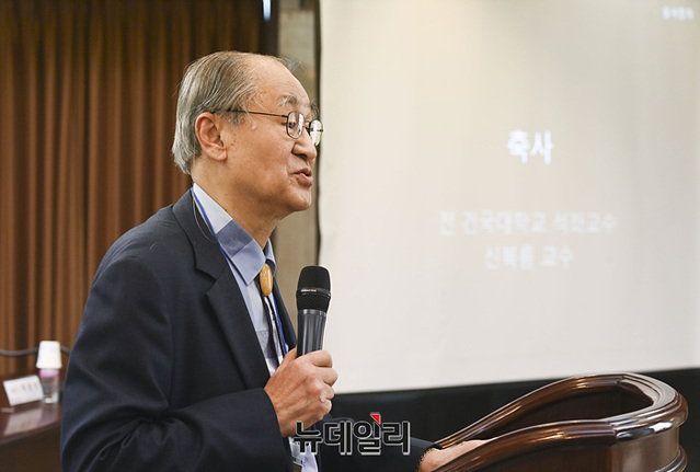신복룡 전 건국대학교 석좌교수가 6일 오전 서울 중구 한국프레스센터에서 열린 '한미동맹 70주년 기념 학술대회'에서 축사를 하고 있다.'한미동맹의 역사와 미래'를 주제로 열린 학술대회에는 △강여린 서울대 외교학 박사 △김정민 연세대 정치학 박사 △김승욱 중앙대 명예교수 △양준석 국민대 교수 △조의행 한국법제연구원 해외법제조사위원 △홍용표 한양대 교수 △박휘락 국민대 특임교수 △남광규 고려대 아세아문제연구원 연구교수 △박영준 국방대 안보대학원 교수가 발표자로 나섰다.
