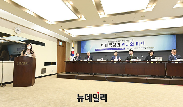 한국정치외교사학회가 주최하는 '한미동맹 70주년 기념 학술대회'가 6일 오전 서울 중구 한국프레스센터에서 '한미동맹의 역사와 미래'를 주제로 진행되고 있다.'한미동맹의 역사와 미래'를 주제로 열린 학술대회에는 △강여린 서울대 외교학 박사 △김정민 연세대 정치학 박사 △김승욱 중앙대 명예교수 △양준석 국민대 교수 △조의행 한국법제연구원 해외법제조사위원 △홍용표 한양대 교수 △박휘락 국민대 특임교수 △남광규 고려대 아세아문제연구원 연구교수 △박영준 국방대 안보대학원 교수가 발표자로 나섰다.